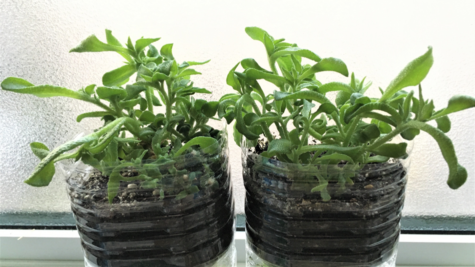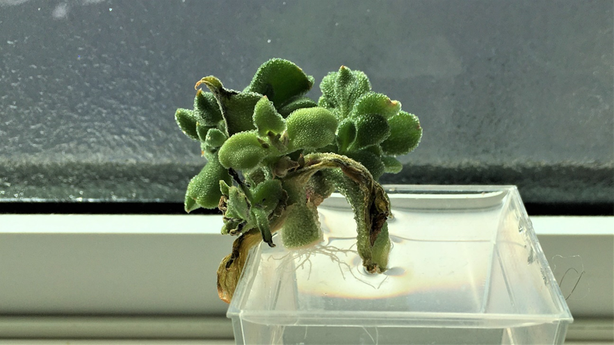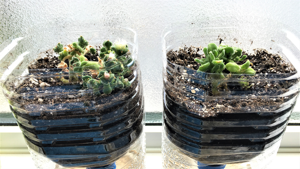 挿し芽とするアイスプラントは地元で採れた食材を扱う近所のお店で購入しました。2本の挿し穂をつくり、挿し芽を始めてから64日後に、一方の挿し穂に花が咲きました。また、いずれの挿し穂も根が複数伸びてきたので、挿し芽を始めてから66日後に、土(培養土)に植え替えることにしました。